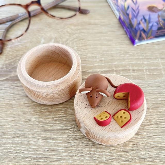 Cette boîte ronde est ornée d’une souris couleur caramel et de morceaux de fromage. Ces pièces sont modelées à la main en argile polymère, ce qui rend chaque création unique.