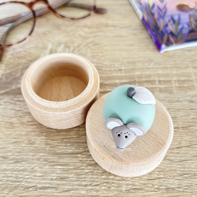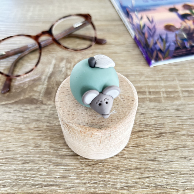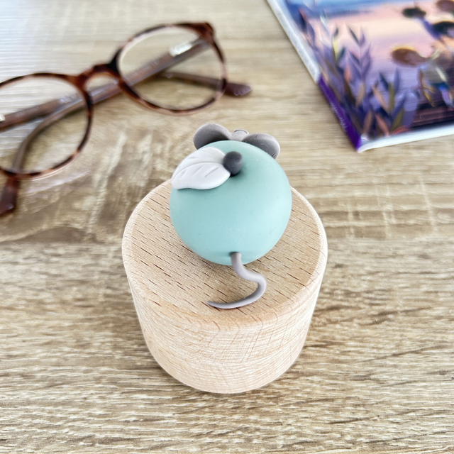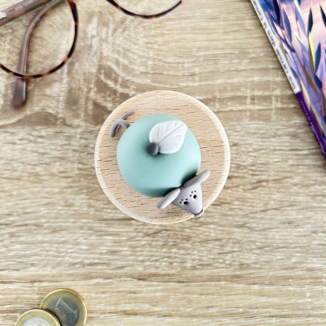 Cette boîte ronde est ornée d’une souris couleur taupe qui se cache dans une belle pomme vert amande. Ces pièces sont modelées à la main en argile polymère, ce qui rend chaque création unique.