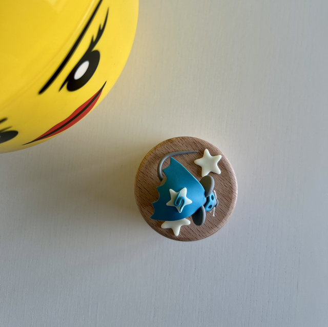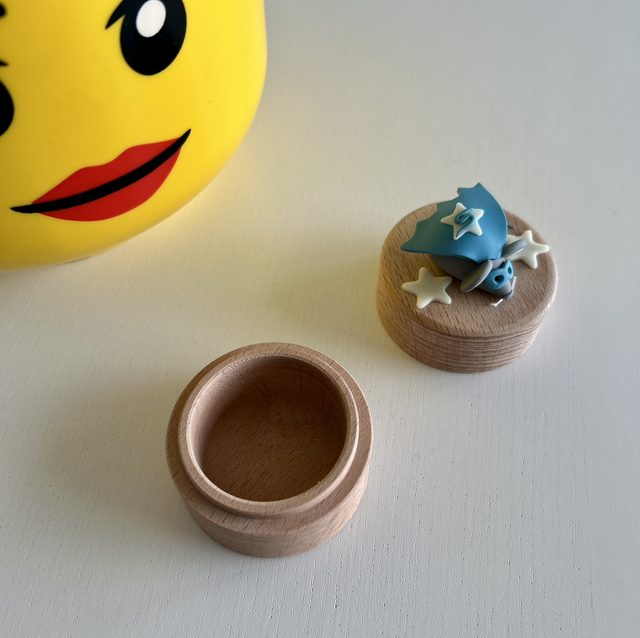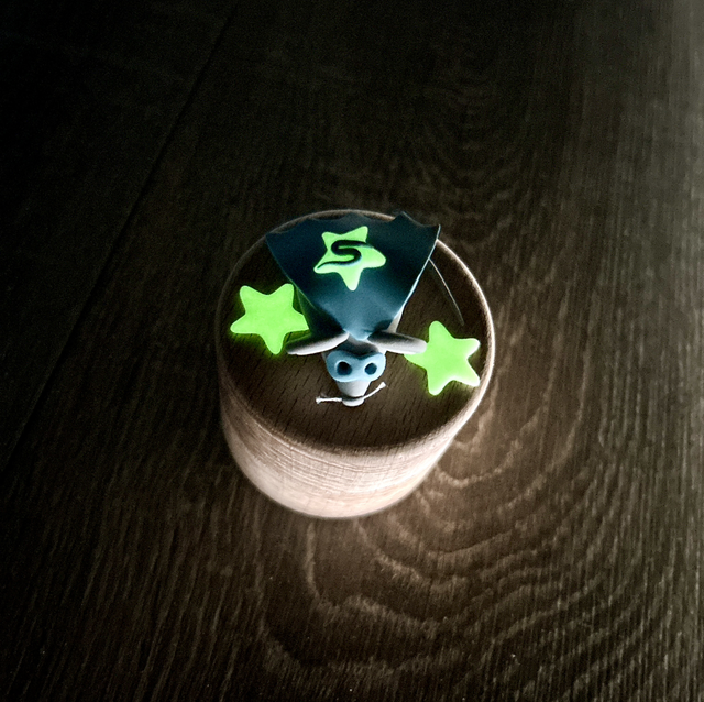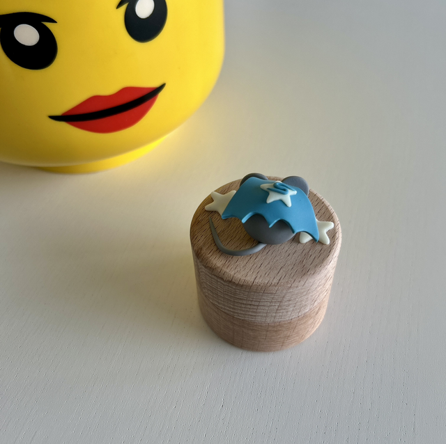 Cette boîte en bois ronde est décorée d'une souris de couleur grise qui porte un masque et une cape de super héros ainsi que d'étoiles phosphorescentes. Ces pièces sont en argile polymère, elles ont été modelées à la main. Les petites dents de lait seront ainsi sagement conservées.