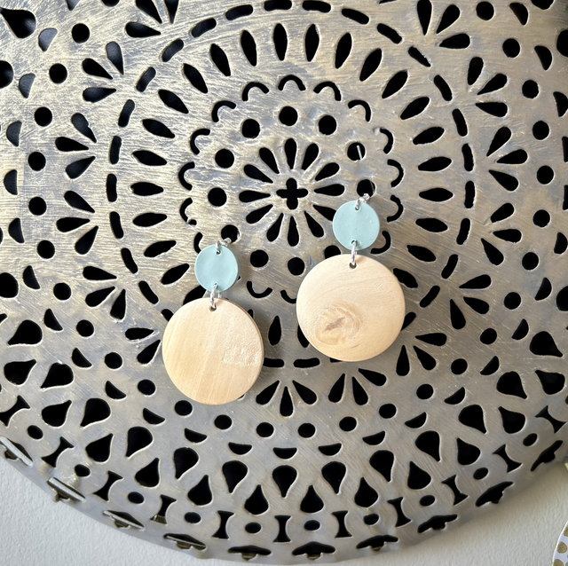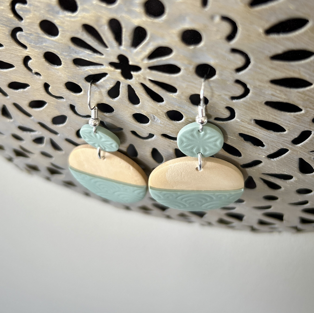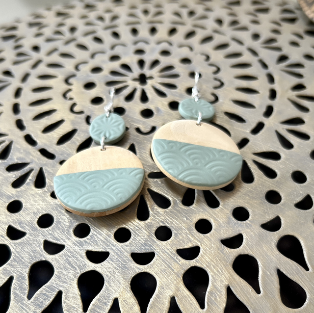 Cette paire de boucles d'oreille est composée de perles de bois, de motifs japonais vert amande modelés en argile polymère, de tiges en acier ainsi que de crochets d'oreille en argent 925. Deux fermoirs en silicone sont livrés avec les boucles.