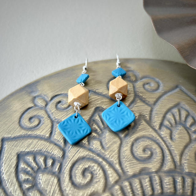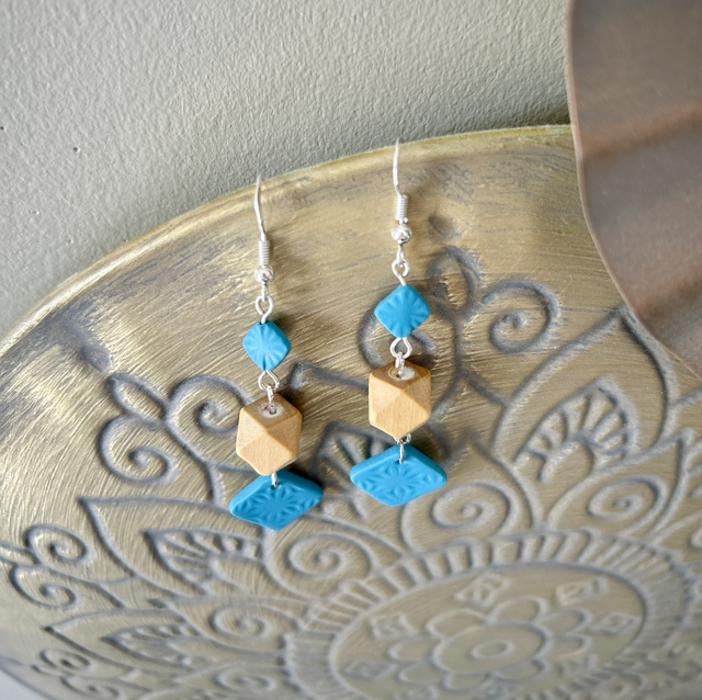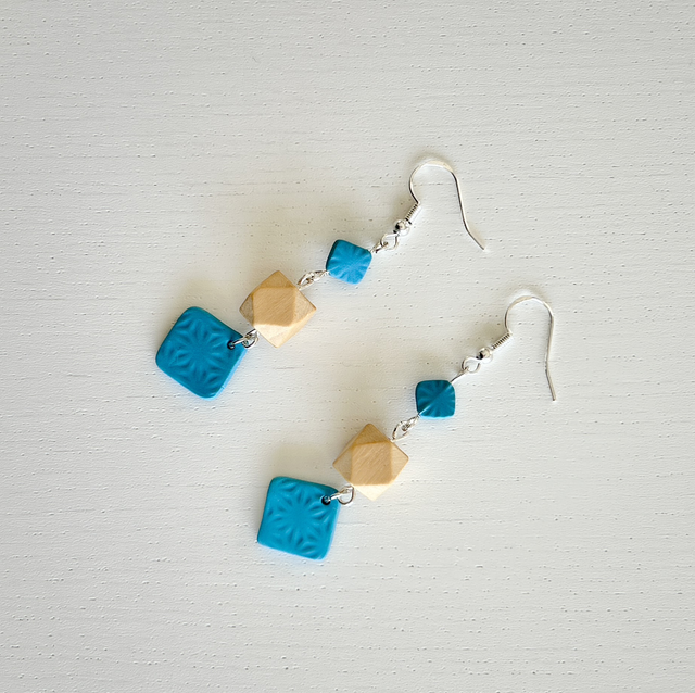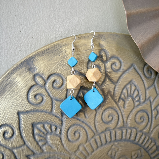 Cette paire de boucles d'oreille est composée de perles de bois, de losanges bleus modelés en argile polymère, de tiges en acier ainsi que de crochets d'oreille en argent 925. Deux fermoirs en silicone sont livrés avec les boucles.