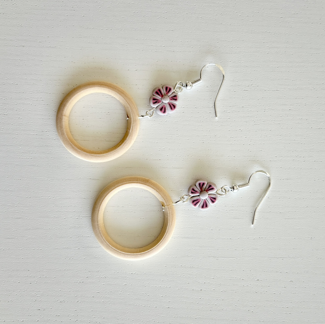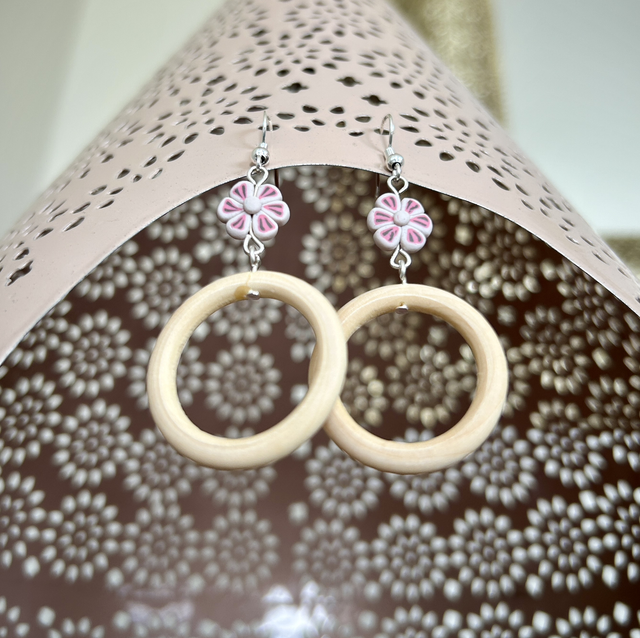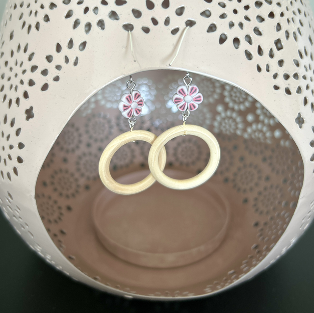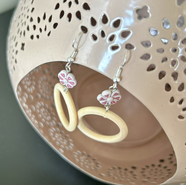 Cette paire de boucles d'oreille est composée d'anneaux de bois, de fleurs de couleur rose poudré et crème modelées en argile polymère, de tiges en acier ainsi que de crochets d'oreille en argent 925. Deux fermoirs en silicone sont livrés avec les boucles.