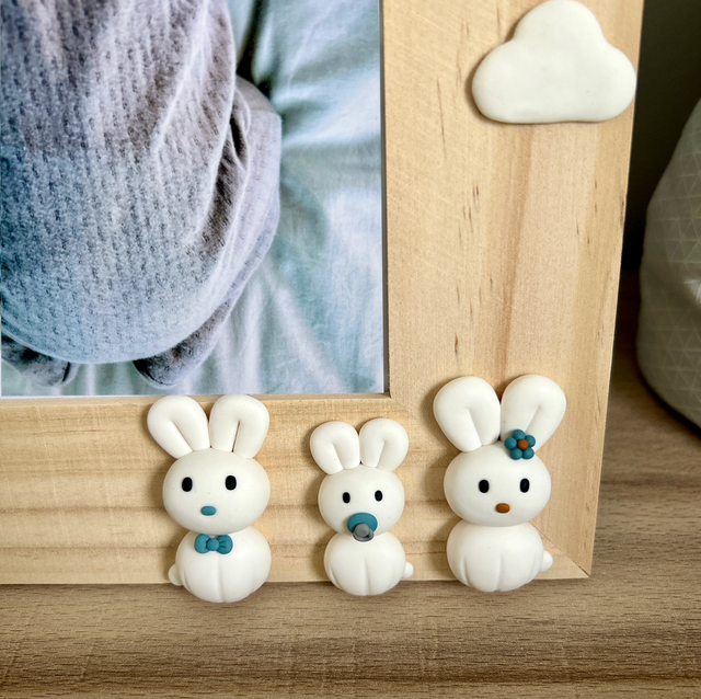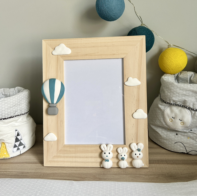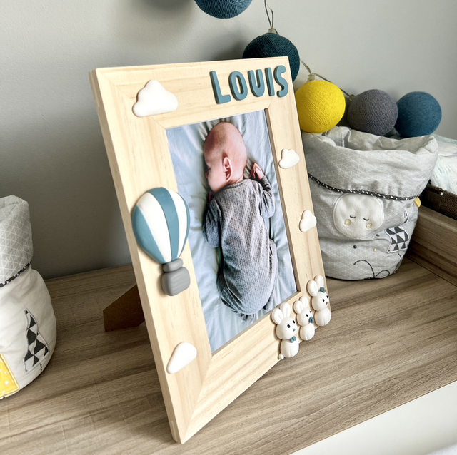Ce cadre photo en bois est décoré d'une famille de lapins blancs, d'une montgolfière bleue, de nuages blanc et du prénom de l'enfant à personnaliser sur demande. Ces pièces sont en argile polymère, elles ont été modelées à la main. Un crochet en laiton au dos du tableau permet de le suspendre. Il peut également être posé grâce à la cravate à l'arrière. Idéal pour offrir lors d'une naissance et pour décorer la chambre d'un enfant.
