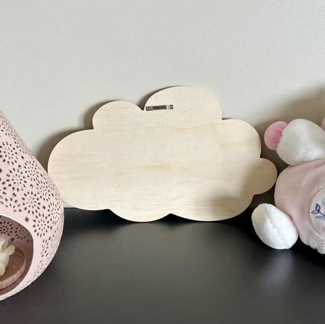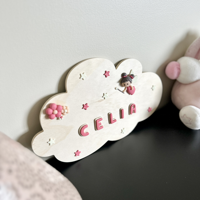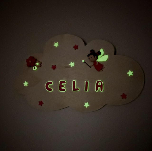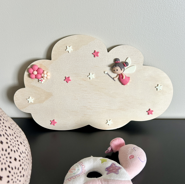 Cette décoration murale est composée d'un nuage en bois, d'une fée, de fleurs, d'étoiles et du prénom de l'enfant à personnaliser sur demande. Ces pièces, en partie phosphorescentes, sont en argile polymère, elles ont été modelées à la main. Une attache métallique, au dos du nuage, permet de le suspendre. Idéal pour offrir lors d'une naissance et pour décorer la chambre d'un enfant.
