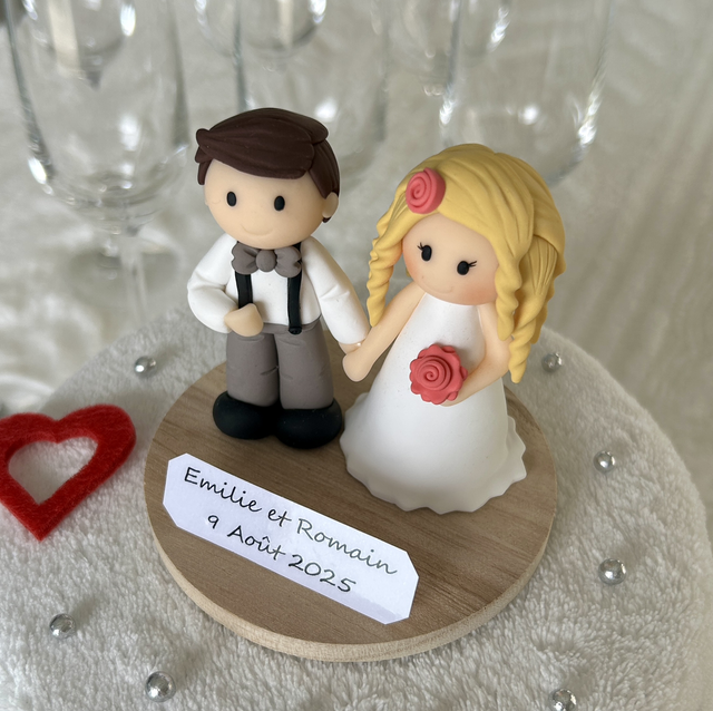 Cette décoration est composée d'un socle en bois, d'un couple de mariés et d'une banderole avec les prénoms des mariés et la date du mariage à personnaliser sur demande. Ces pièces sont en argile polymère, elles ont été modelées à la main. Ces figurines sont idéales pour décorer une table ou une pièce montée de mariage. Les personnages peuvent être personnalisés sur demande (sexes, couleurs, tenues...).