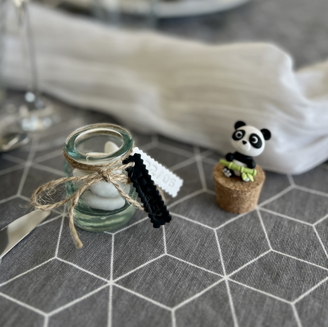 Pot en verre de forme ronde rempli de dragées aux amandes et décoré d'un panda et d'étiquettes prénom et date en argile polymère modelés à la main. Le pot contient environ 18g de dragées (~8 dragées). L'étiquette prénom (prénom, couleur), l'étiquette date (date, couleur) et le choix des dragées (avec ou sans, amande ou chocolat) sont personnalisables sur demande. Prix dégressif en fonction de la quantité, n'hésitez pas à me contacter.