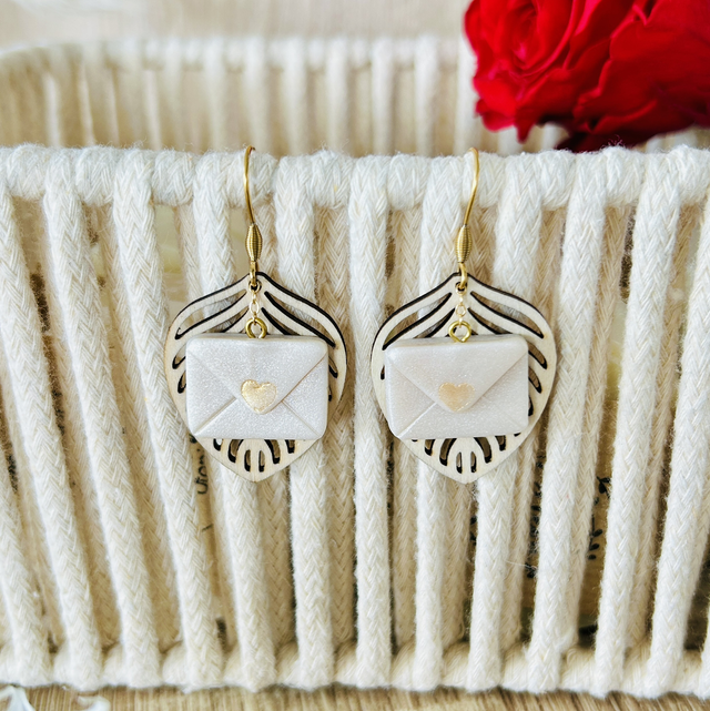 Une petite lettre d’amour en argile polymère, de couleur blanc nacré / crème, vient compléter l’ensemble. Elle est délicatement fermée par un petit cœur doré et accrochée par une petite chaîne dorée, ce qui la rend légèrement oscillante, apportant du mouvement et de la légèreté par rapport à la feuille de charme en bois.