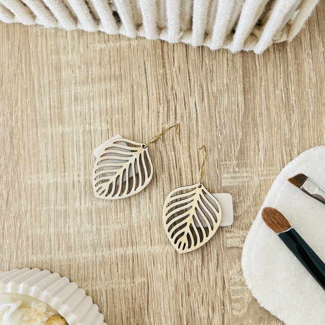 Ces boucles d’oreilles en acier inoxydable doré évoquent la délicatesse et le romantisme des mots que l’on garde précieusement. Elles se composent d’une feuille de charme en bois ajourée, finement découpée au laser, apportant une touche naturelle et élégante.