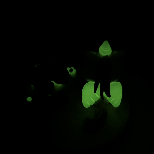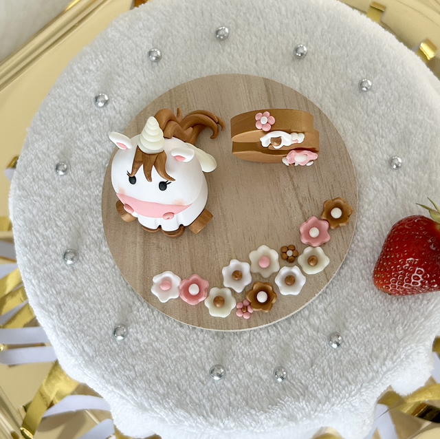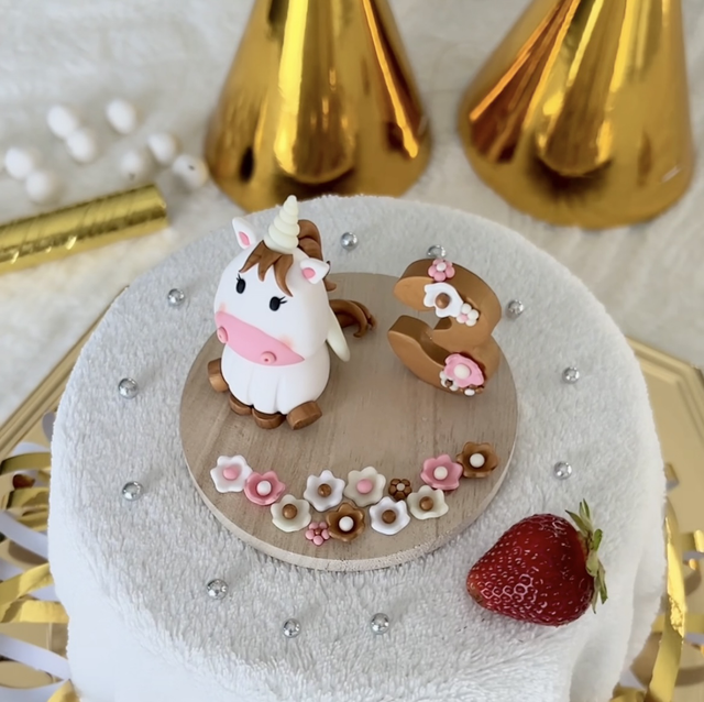 Cette décoration est composée d'un socle en bois, d'une licorne dorée, de fleurs et de l'âge de l'enfant à personnaliser sur demande. Ces pièces sont en argile polymère, elles ont été modelées à la main. Certains éléments, tels que la corne et les ailes de la licorne sont phosphorescents. Cette figurine est idéale pour décorer une table ou un gâteau d'anniversaire.