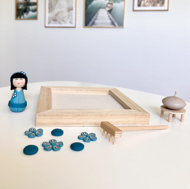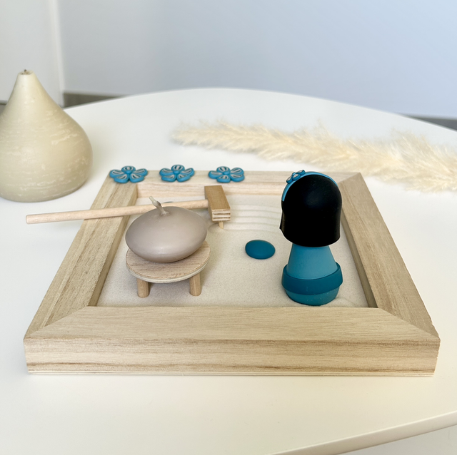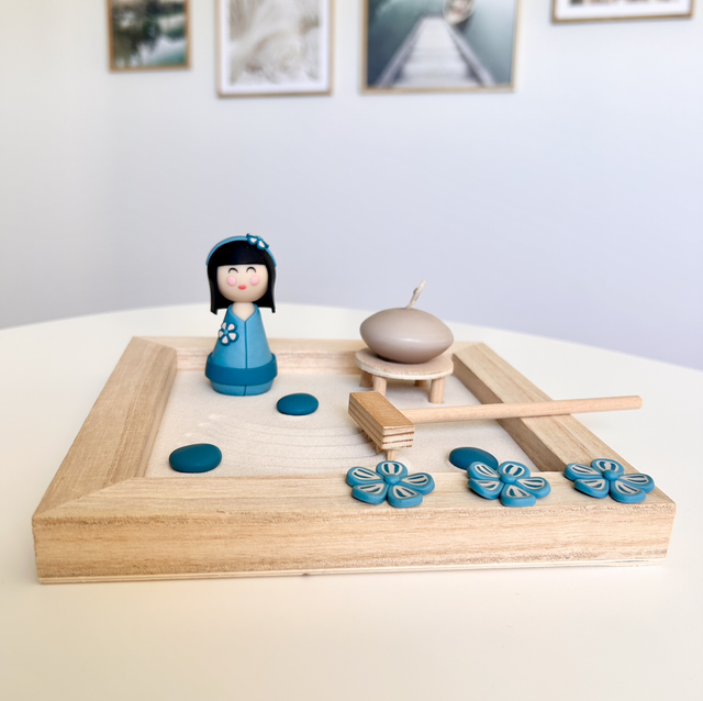 Ce jardin zen est composé d'un plateau en bois rempli de sable fin. Il est agrémenté d'un râteau et d'un support de bougie en bois fabriqués à la main en bois, ainsi que d'une poupée kokeshi bleue, de fleurs et de galets modelés à la main, en argile polymère. Des petits patins en feutrine sont collés sous le plateau pour être manipuler sans rayer. Enfin, une bougie est incluse, pour encore plus de détente! Tous les éléments sont à placer selon vos envies sur le plateau, voilà de quoi vous rendre zen et décorer votre intérieur. Ce jardin zen peut être un cadeau original et personnalisé pour vos proches.