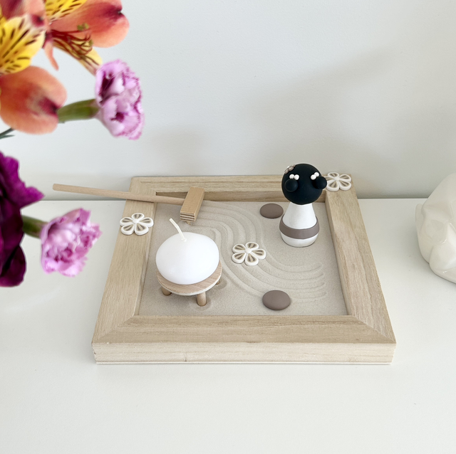Ce jardin zen est composé d'un plateau en bois rempli de sable fin. Il est agrémenté d'un râteau et d'un support de bougie en bois fabriqués à la main en bois, ainsi que d'une poupée kokeshi blanche, de fleurs et de galets modelés à la main, en argile polymère. Des petits patins en feutrine sont collés sous le plateau pour être manipuler sans rayer. Enfin, une bougie est incluse, pour encore plus de détente! Tous les éléments sont à placer selon vos envies sur le plateau, voilà de quoi vous rendre zen et décorer votre intérieur. Ce jardin zen peut être un cadeau original et personnalisé pour vos proches.